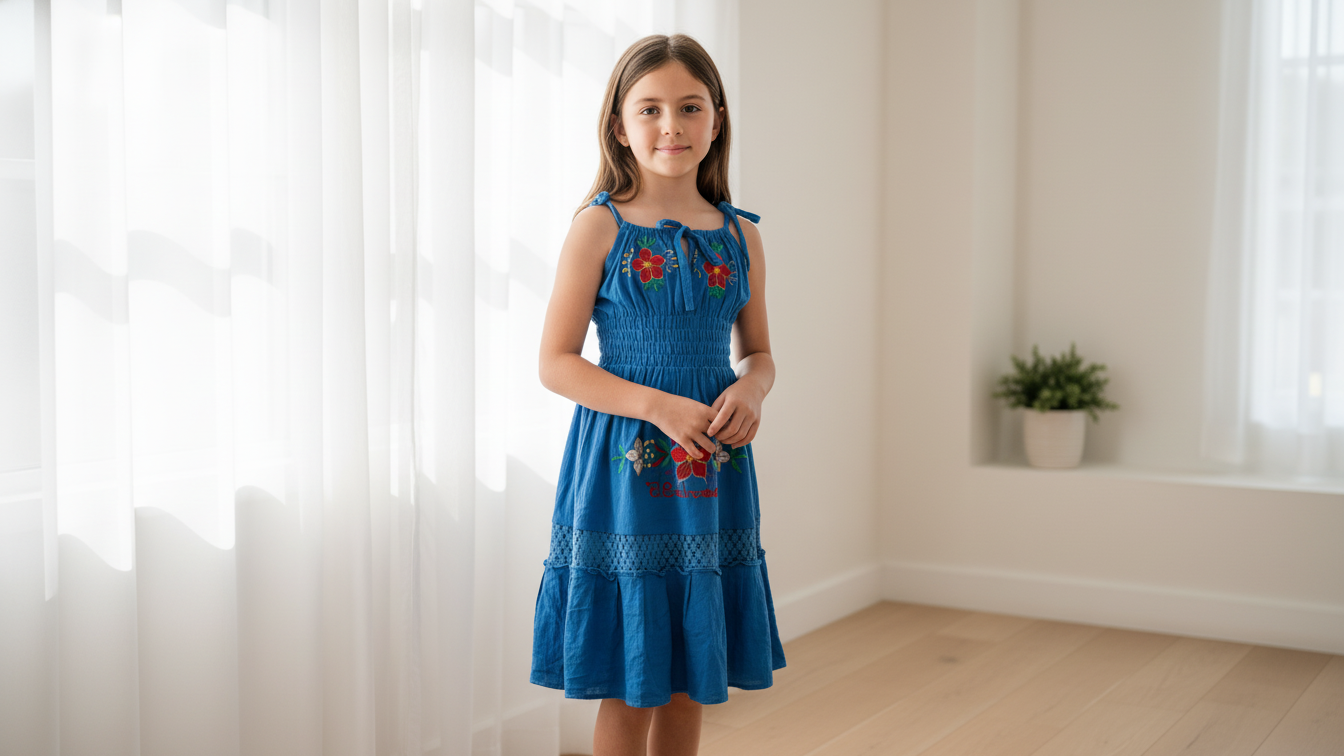 Delight your little one with our enchanting Children’s Handcrafted Embroidered Sundress, a vibrant celebration of artisanal skill. This beautiful blue dress features delicate spaghetti straps and a gracefully tiered skirt, perfect for sunny days and playful adventures.