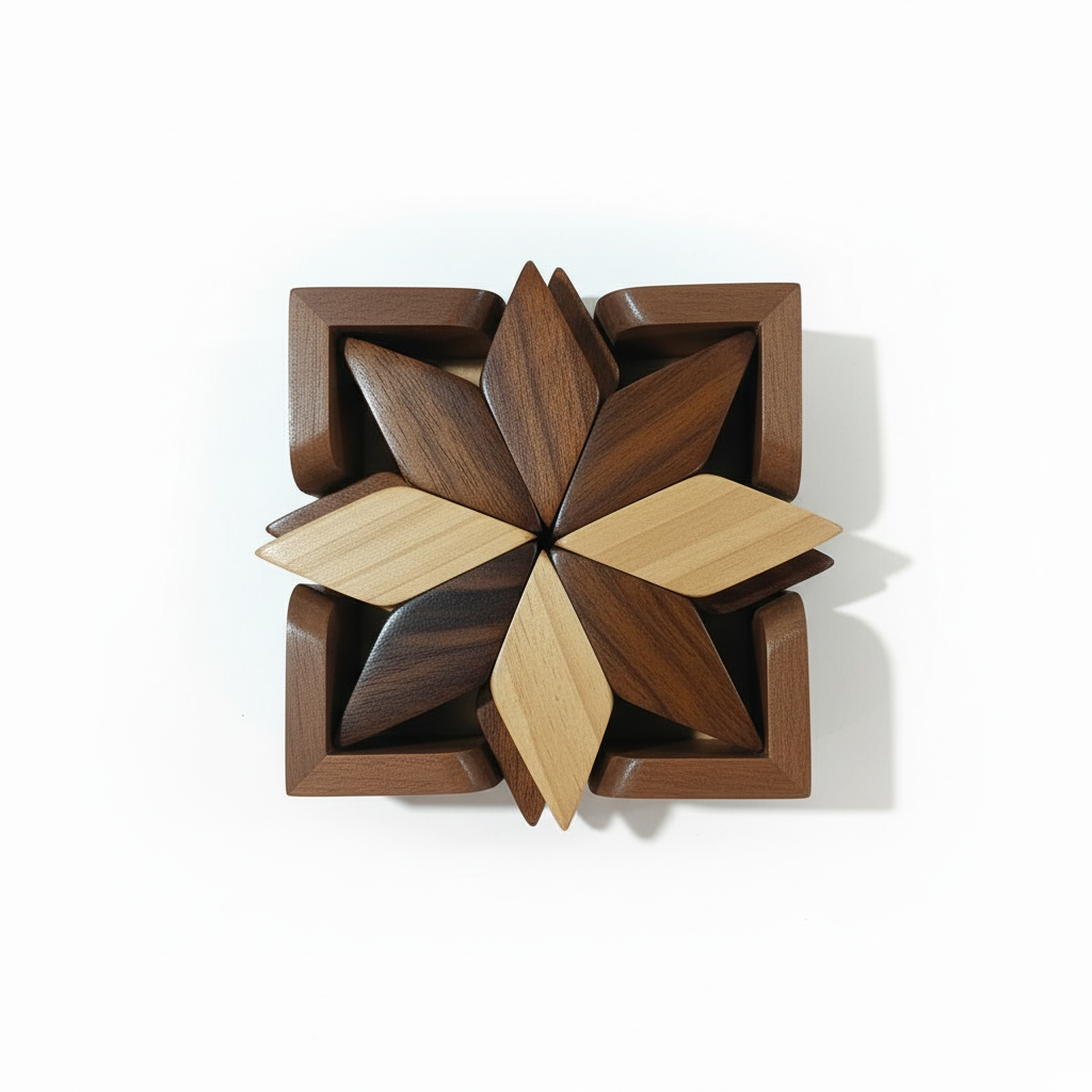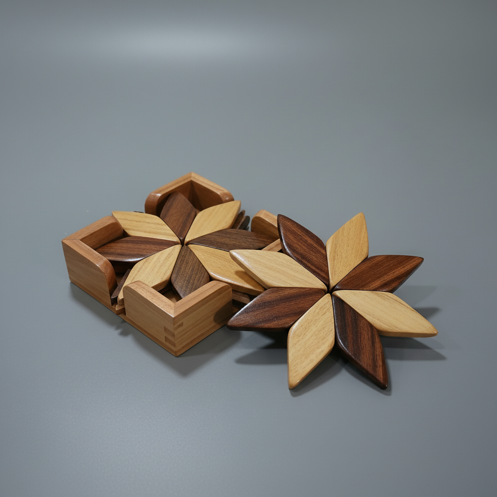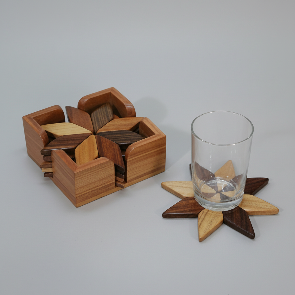 Elevate your entertaining and protect your tabletops with our exquisite Handcrafted Multi-Toned Wooden Star Coaster Set. This distinctive collection features six star-shaped coasters, meticulously pieced together from various natural hardwoods, creating a captivating mosaic of natural colors and grain patterns. The inherent beauty of the different wood tones—ranging from light golden hues to rich dark browns—forms an elegant, decorative star motif on each coaster.