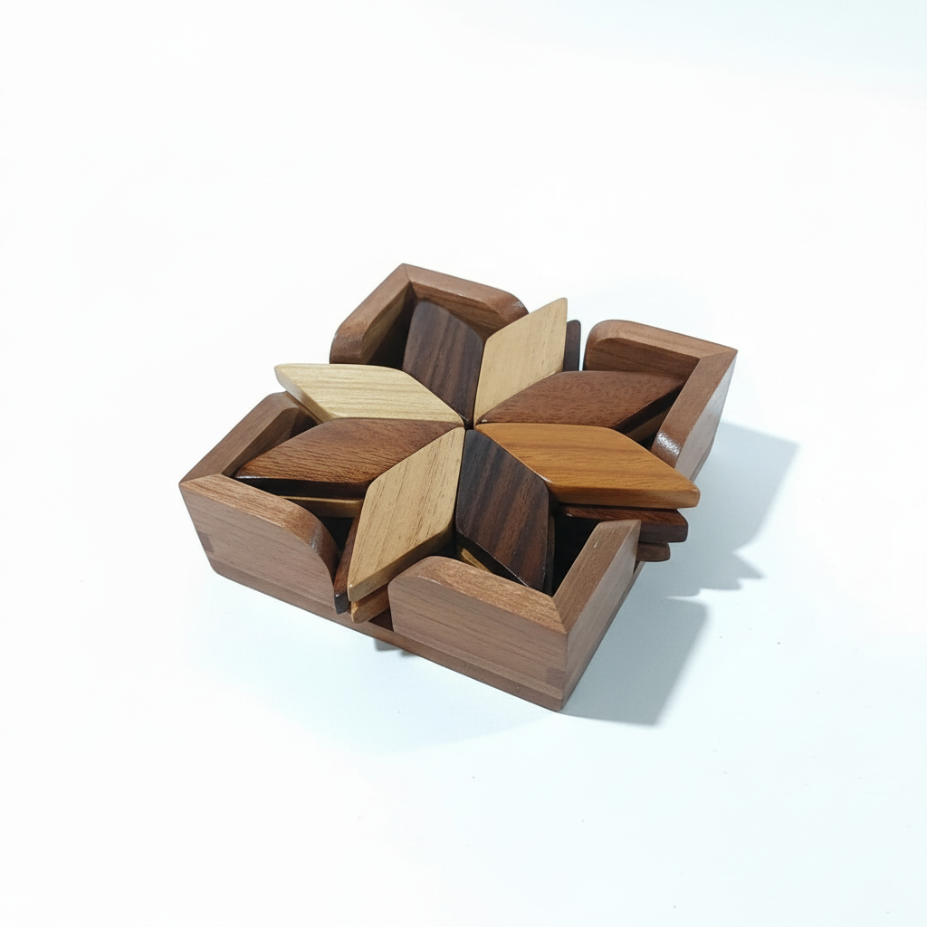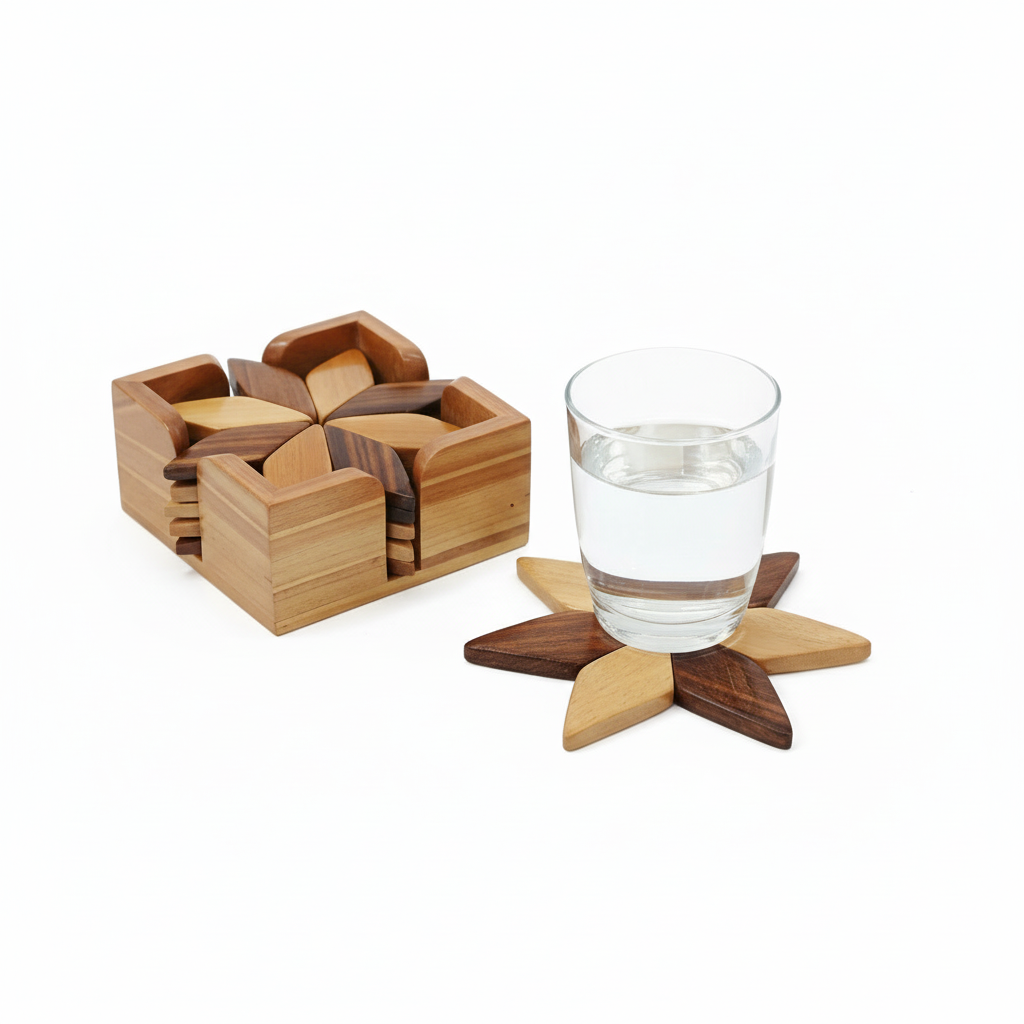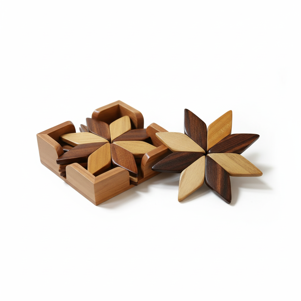 Handcrafted Multi-Toned Wooden Star Coaster Set with Holder (Set of 6)