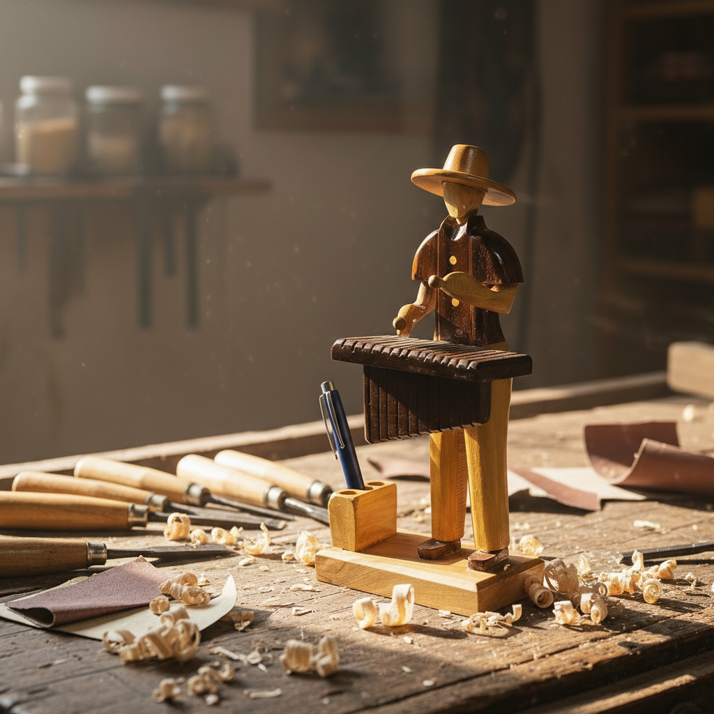Handcrafted Wooden Musician Figurine with Pencil Holder – Xylophone Motif
