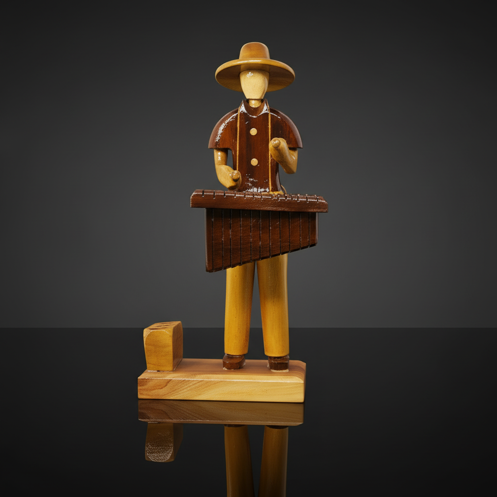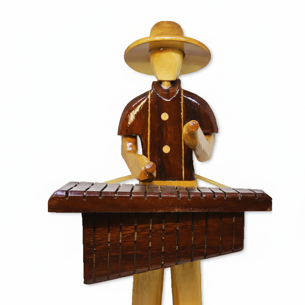 Celebrate the vibrant spirit of music and traditional craftsmanship with our Handcrafted Wooden Musician Playing Marimba Figurine. Meticulously carved and polished from contrasting hardwoods, this charming artisan piece depicts a musician in folk attire skillfully playing a marimba. The figure is characterized by its distinct two-tone wood finish—lighter natural tones for the body and hat, complemented by a darker, rich stain for the shirt and the intricate marimba keys.