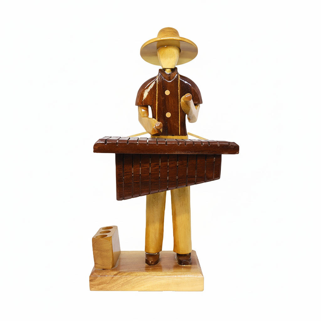 Celebrate the vibrant spirit of music and traditional craftsmanship with our Handcrafted Wooden Musician Playing Marimba Figurine. Meticulously carved and polished from contrasting hardwoods, this charming artisan piece depicts a musician in folk attire skillfully playing a marimba. The figure is characterized by its distinct two-tone wood finish—lighter natural tones for the body and hat, complemented by a darker, rich stain for the shirt and the intricate marimba keys. Integrated into its sturdy base is a clever pen or pencil holder, blending functionality with decorative appeal. This unique figurine is perfect for adding a touch of cultural artistry and musical joy to your desk, bookshelf, or any display area, making it an ideal gift for musicians, artists, or collectors of folk art.