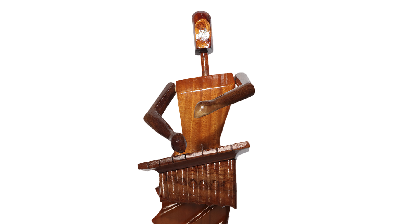 handcrafted wooden musician sculpture, unique marimba decor, wooden music art, gifts for music lovers, artisanal home decor, handmade musical sculptures.