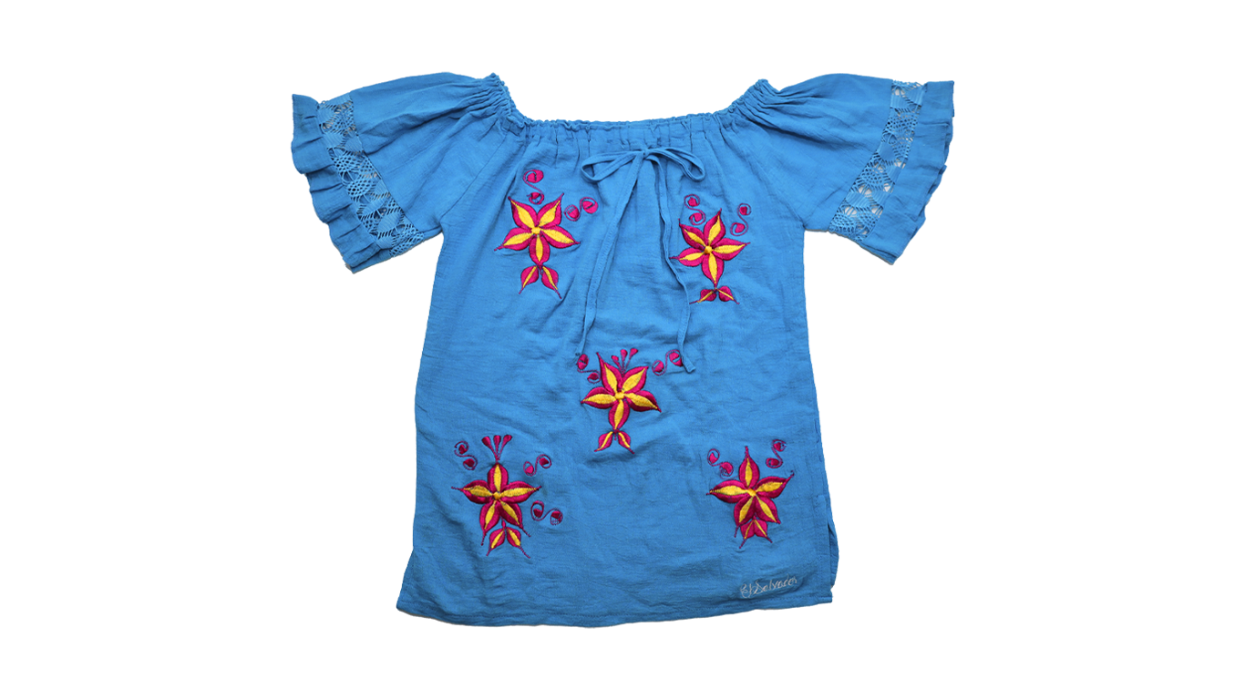 Embrace the beauty of traditional Salvadoran craftsmanship with our stunning Hand-Embroidered Off-Shoulder Blouse. This exquisite piece features a vibrant blue cotton fabric adorned with colorful hand-embroidered flowers that celebrate the rich artisan heritage of El Salvador.