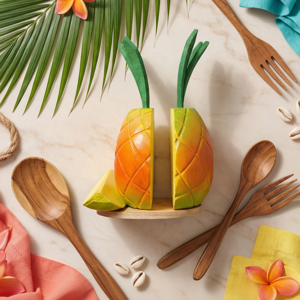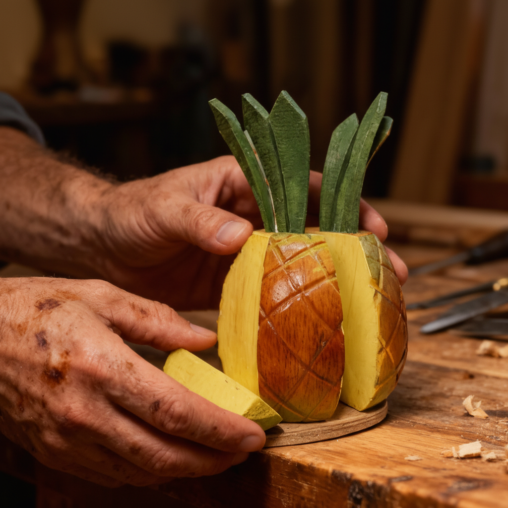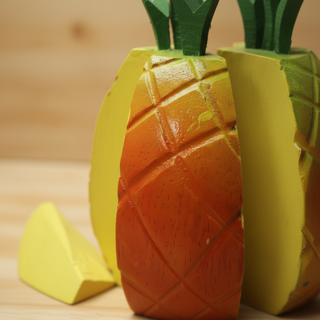 - Color: Green (leaves), yellow, orange, red (pineapple body), natural wood (base)
