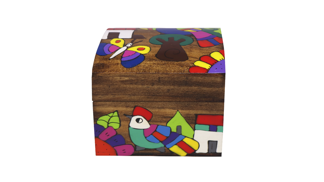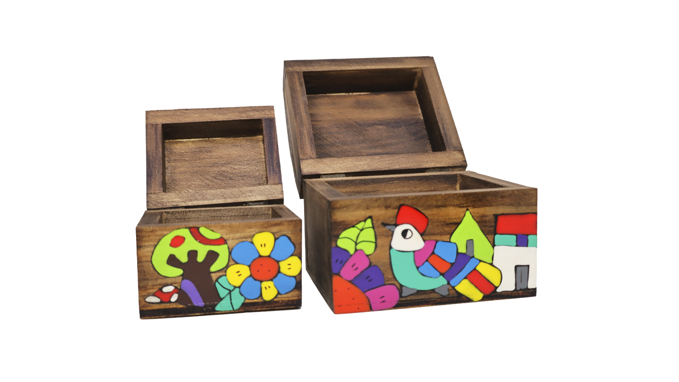 - Artisan and Colorful Design: Two wooden boxes with lids, hand-painted with unique and vibrant patterns.
