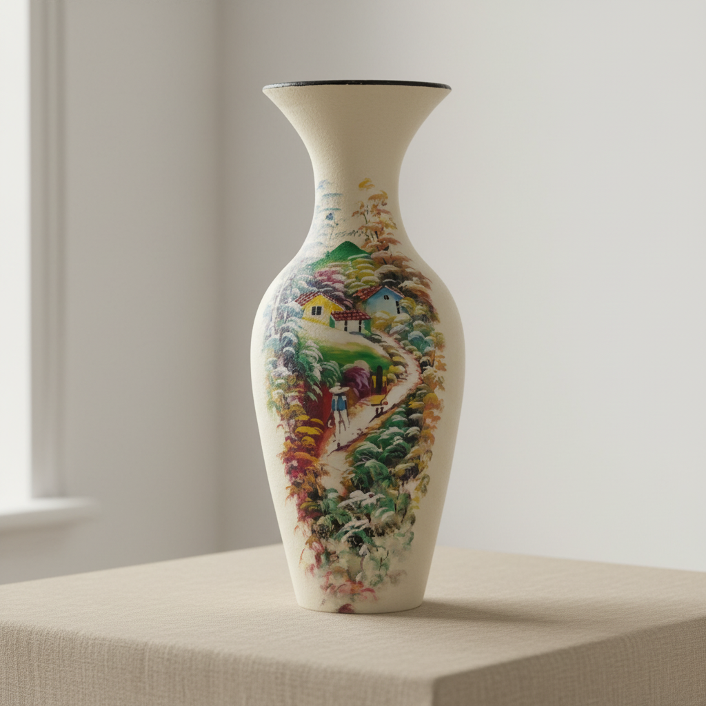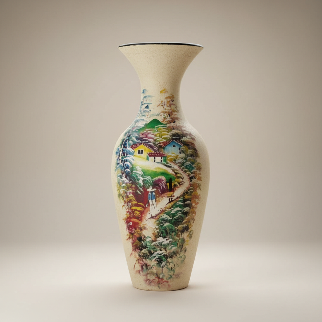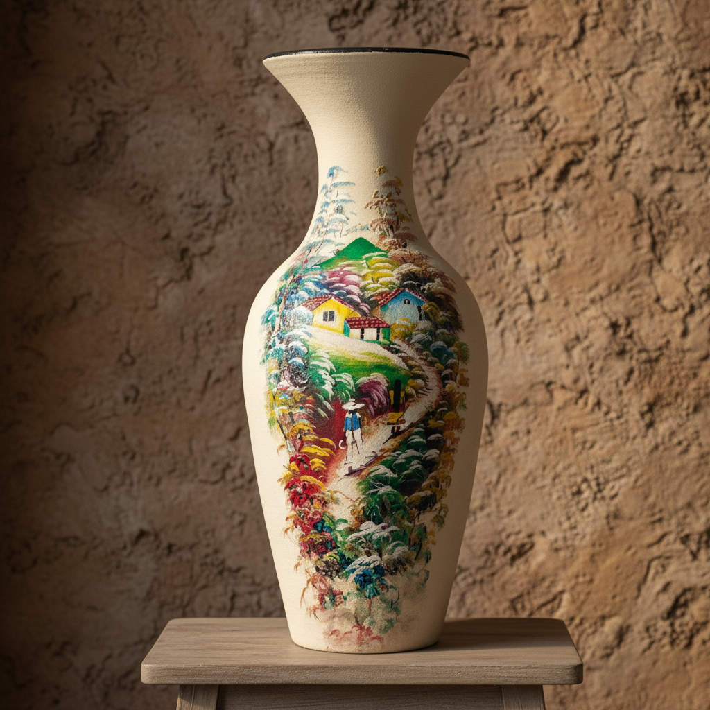 Introduce serene elegance and artisanal charm to your living space with our Tall Hand-Painted Red Clay Floor Vase. Standing at an impressive 75 cm (approximately 29.5 inches) and weighing 15.75 lbs (7.1 kg), this graceful vase is meticulously sculpted from traditional “barro rojo” (red clay). It features a calming cream-colored base, serving as a pristine canvas for an artfully hand-painted landscape decoration. This intricate motif, possibly depicting a tranquil village scene or a serene natural vista, is rendered in soft, complementing hues, creating a captivating focal point for any room. This piece celebrates Salvadoran craftsmanship, bringing authentic beauty and handmade splendor to your home with a timeless appeal.