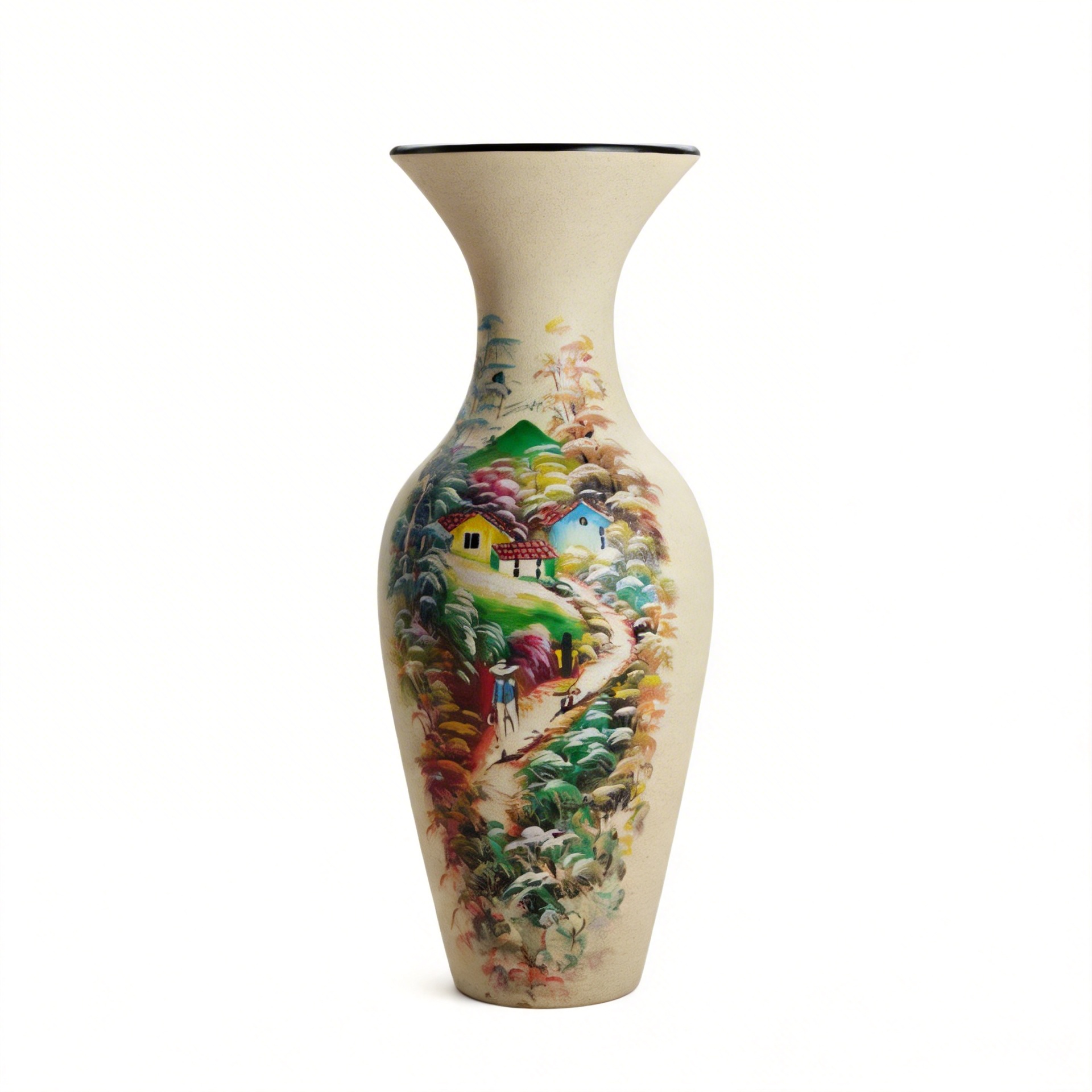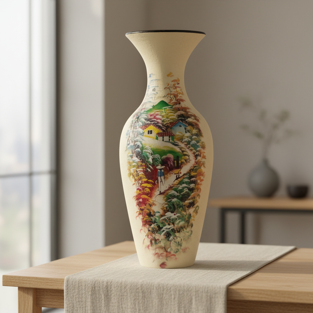 Tall Handcrafted Clay Floor Vase – Cream Body with Landscape Decoration Motif
