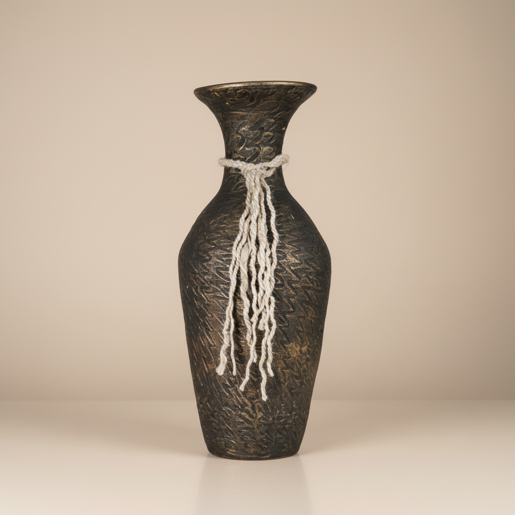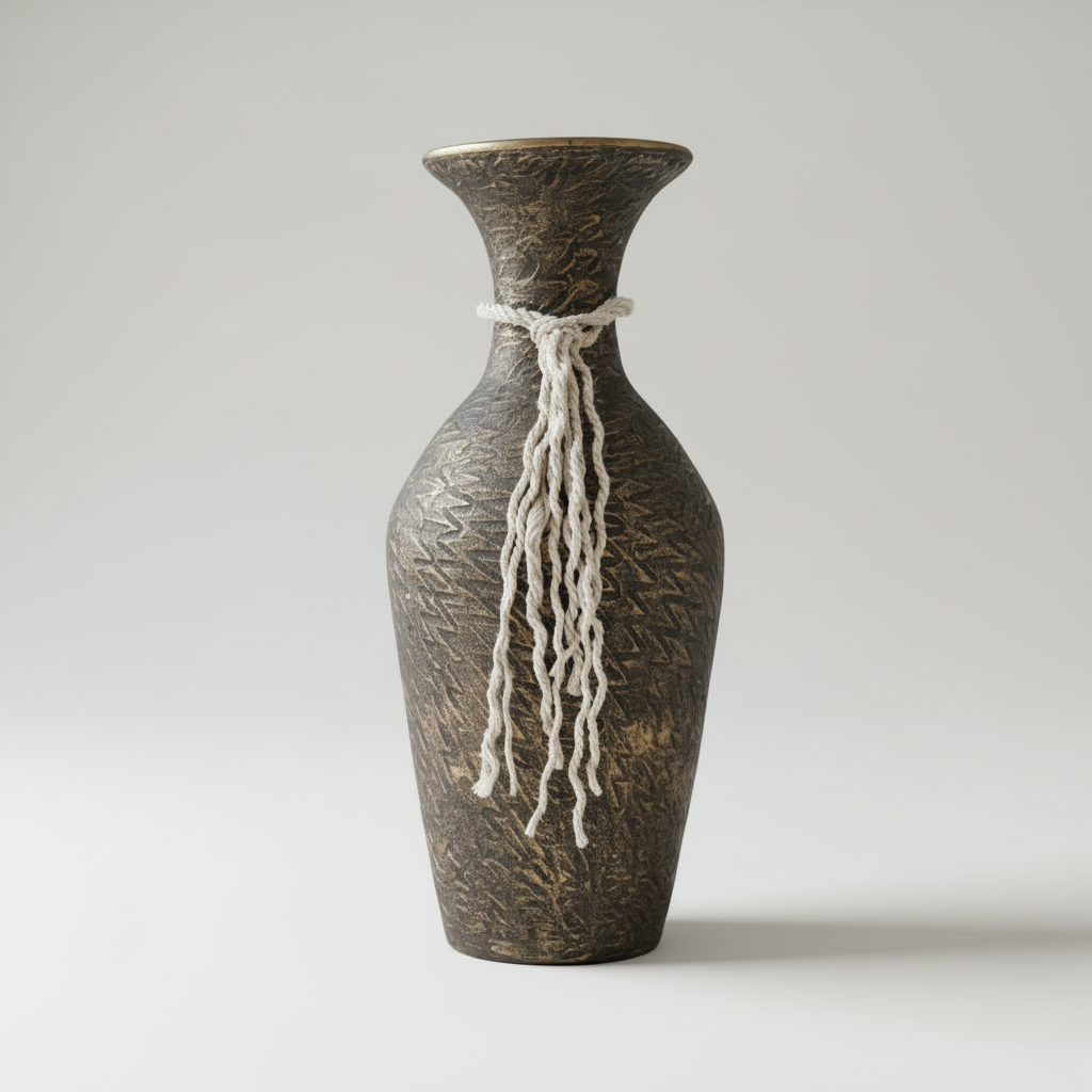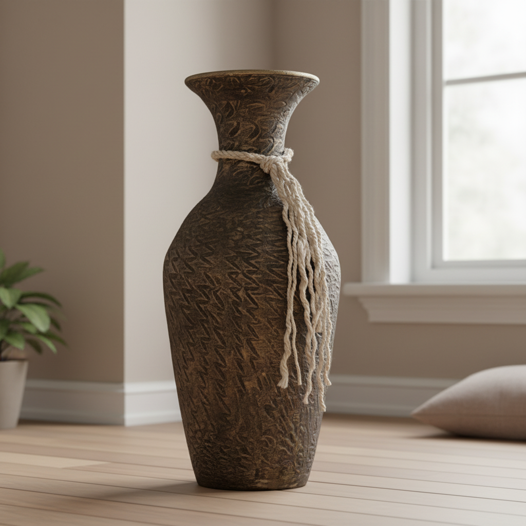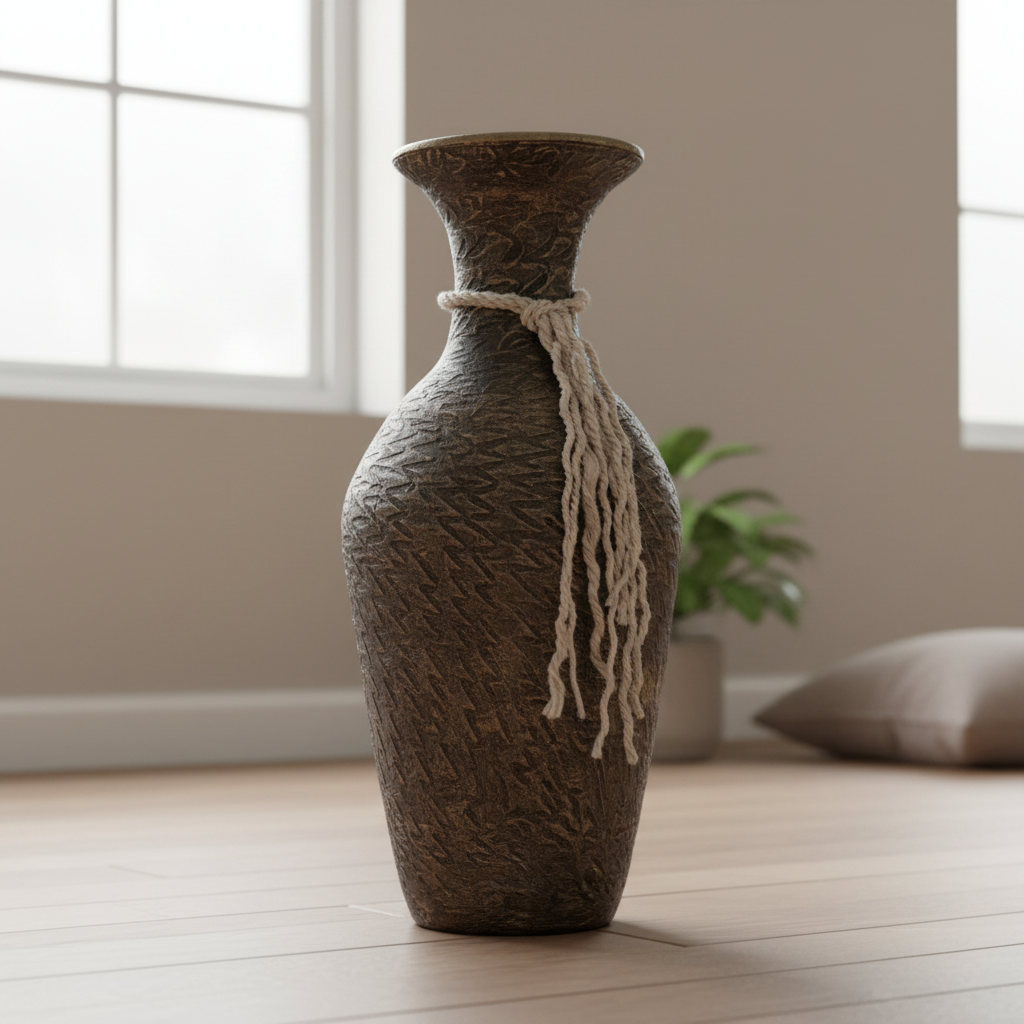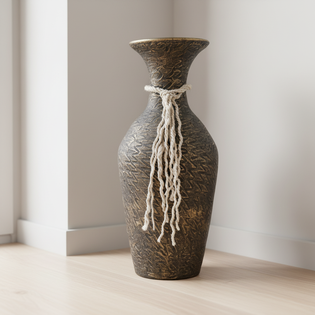 Tall Handcrafted Clay Floor Vase – Dark Aged Bronze Tone & Natural Rope Motif