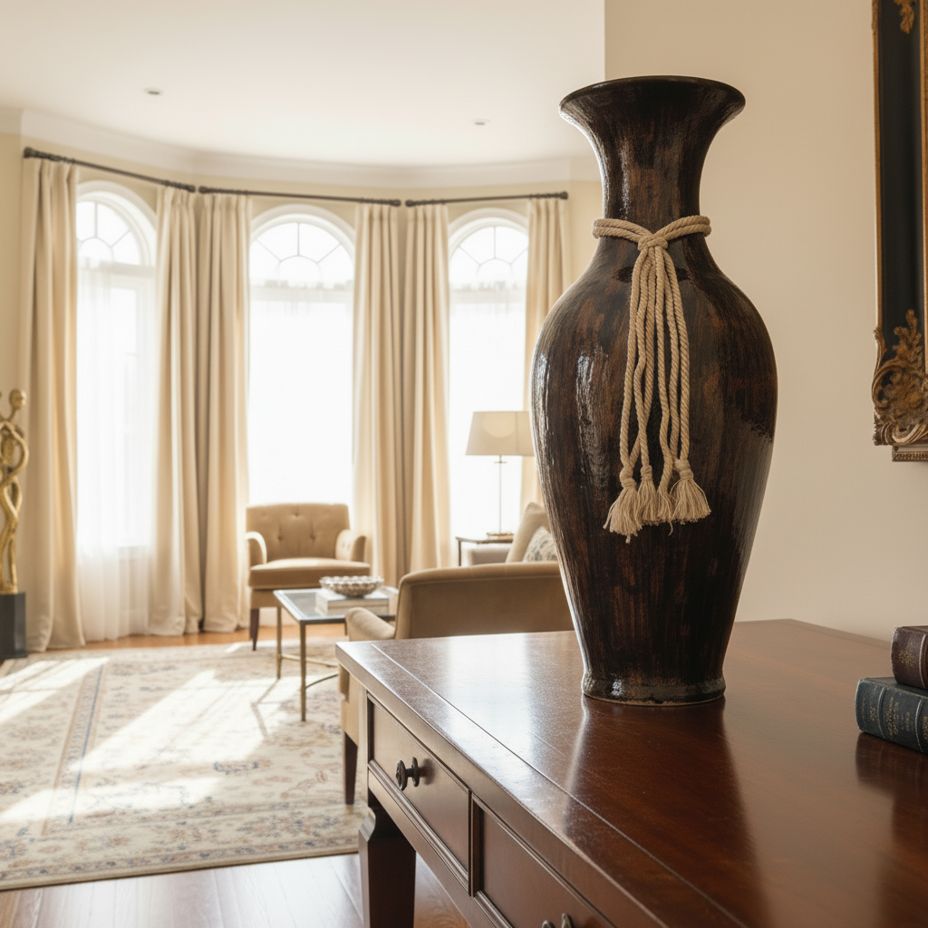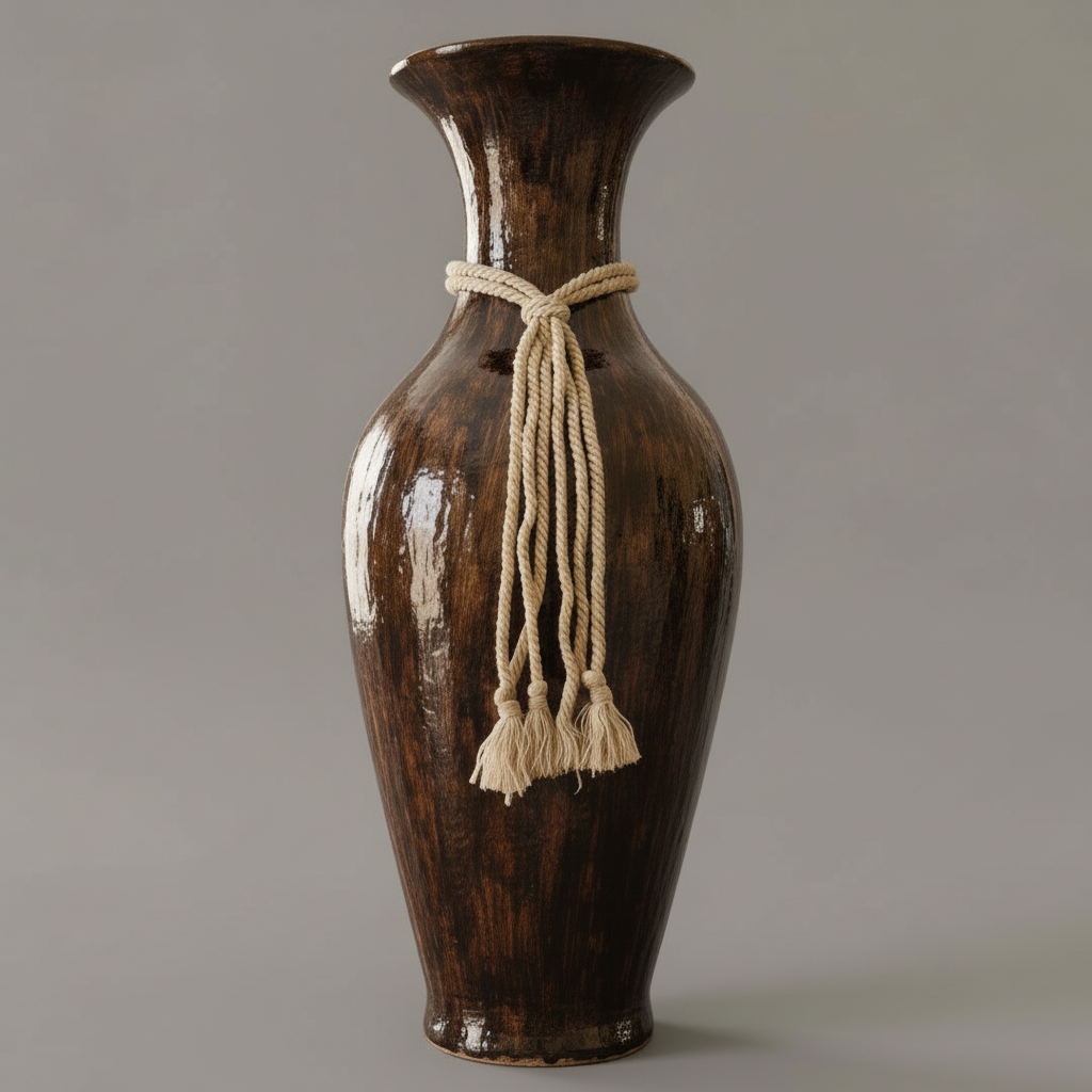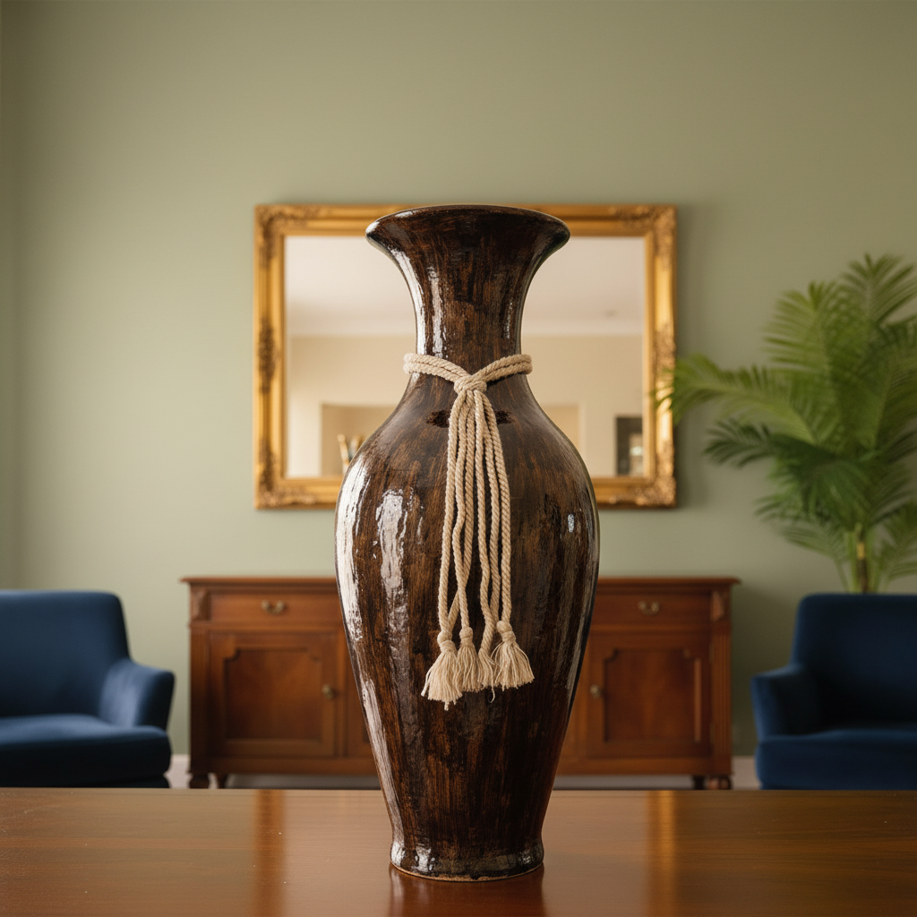 Command attention in your living space with our Tall Hand-Painted Red Clay Floor Vase, a piece rich in character and artisanal detail. Standing at an impressive 75 cm (approximately 29.5 inches) and weighing 15.75 lbs (7.1 kg), this majestic vase is meticulously sculpted from traditional “barro rojo” (red clay). It features a deep, earthy brown finish, exuding a sense of timeless sophistication. A prominent Natural “rope” Accent detail is elegantly wrapped around its neck and trails down its body, lending a distinctive tactile and visual element.