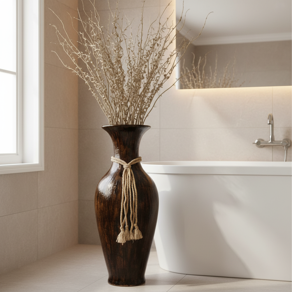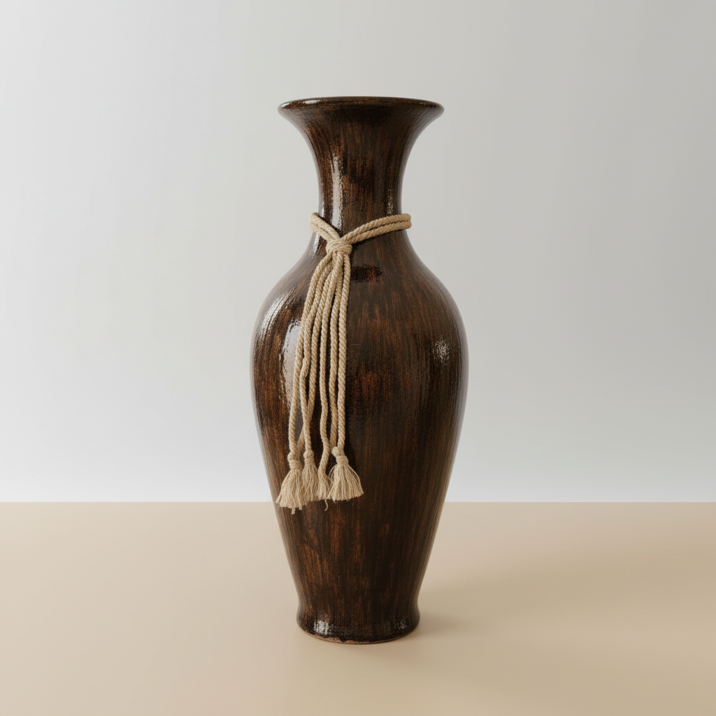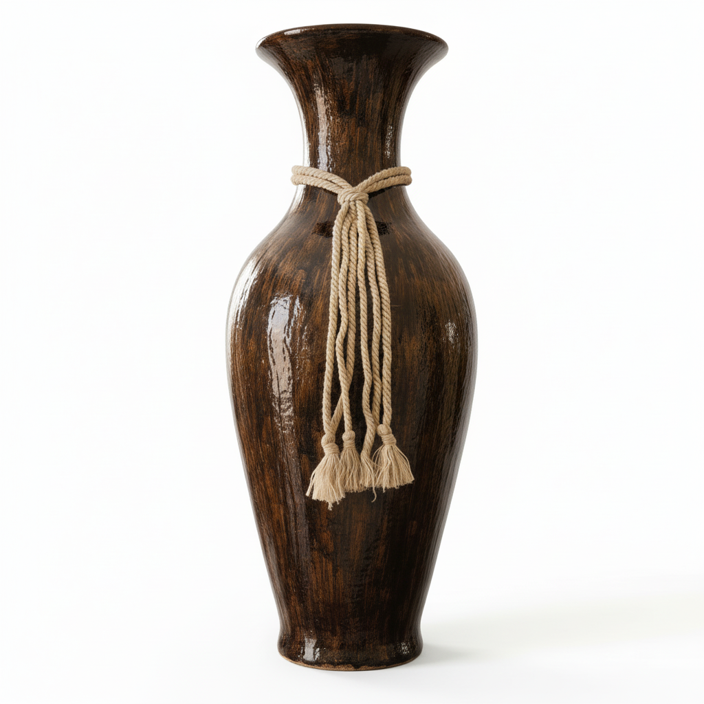 Tall Handcrafted Clay Floor Vase – Dark Brown Textured & Natural Rope Accent